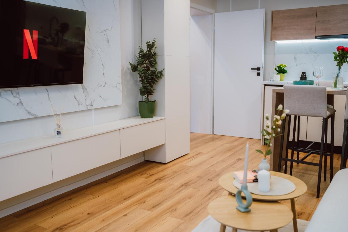 One-Bedroom Apartment. Boasting a private entrance, this air-conditioned apartment features 1 living room, 1 separate bedroom and 1 bathroom with a walk-in shower and a hairdryer. In the well-equipped kitchen, guests will find a stovetop, a refrigerator, a dishwasher and kitchenware. This apartment has soundproof walls, flat-screen TV with streaming services, city views, as well as chocolate for guests. The unit has 2 beds.